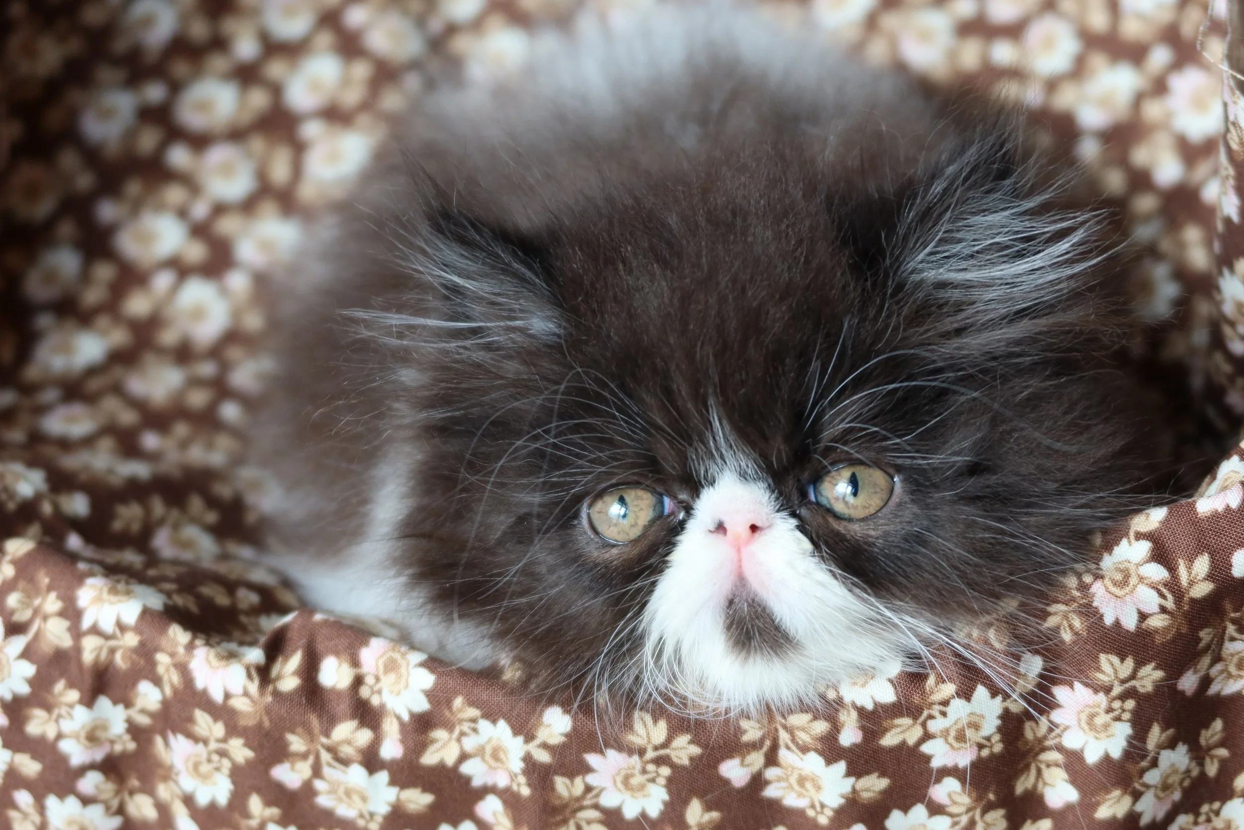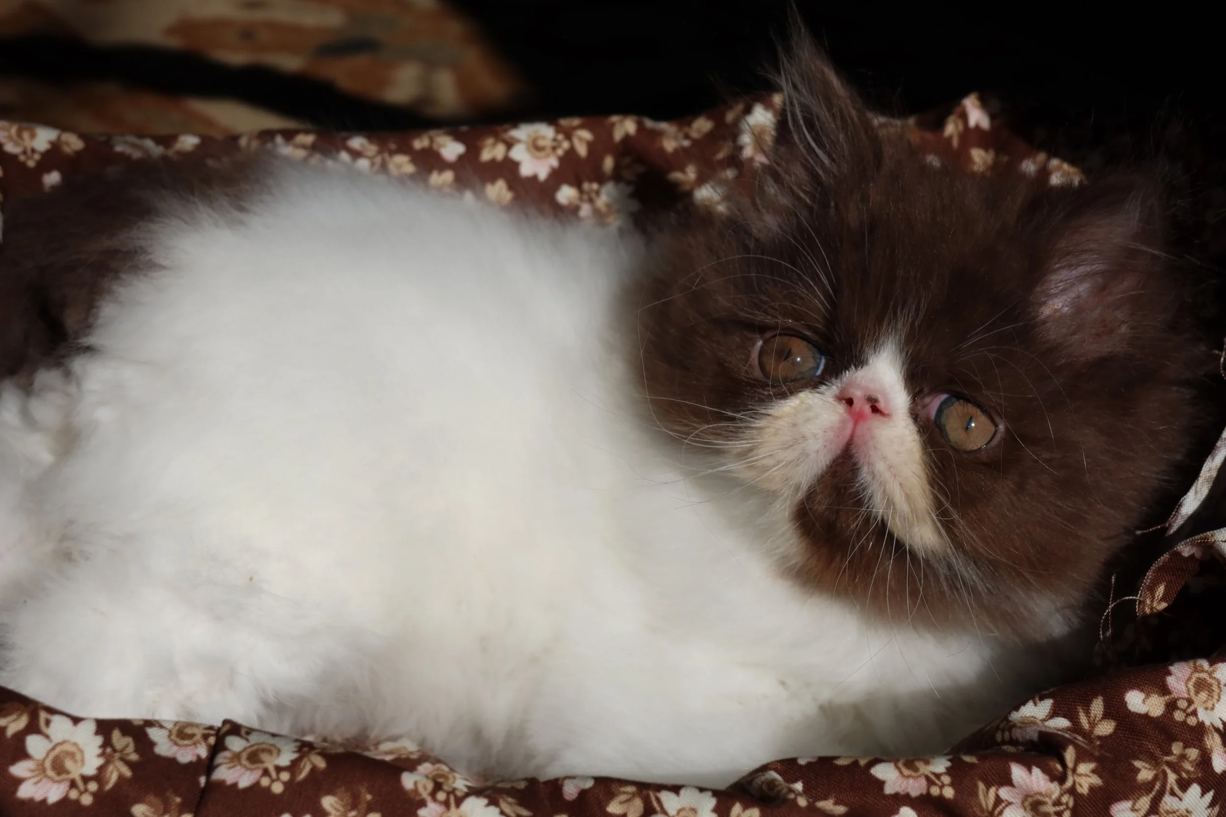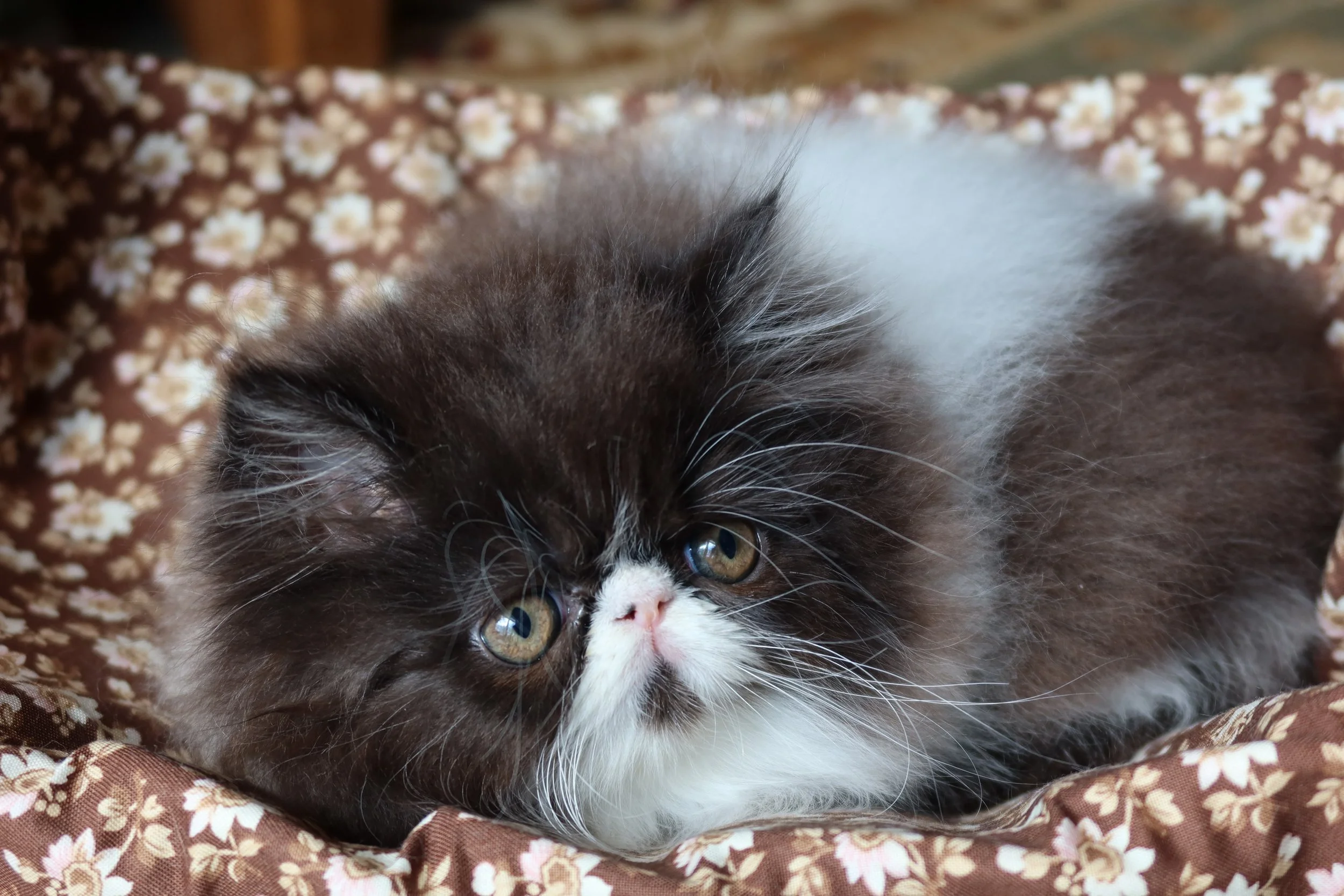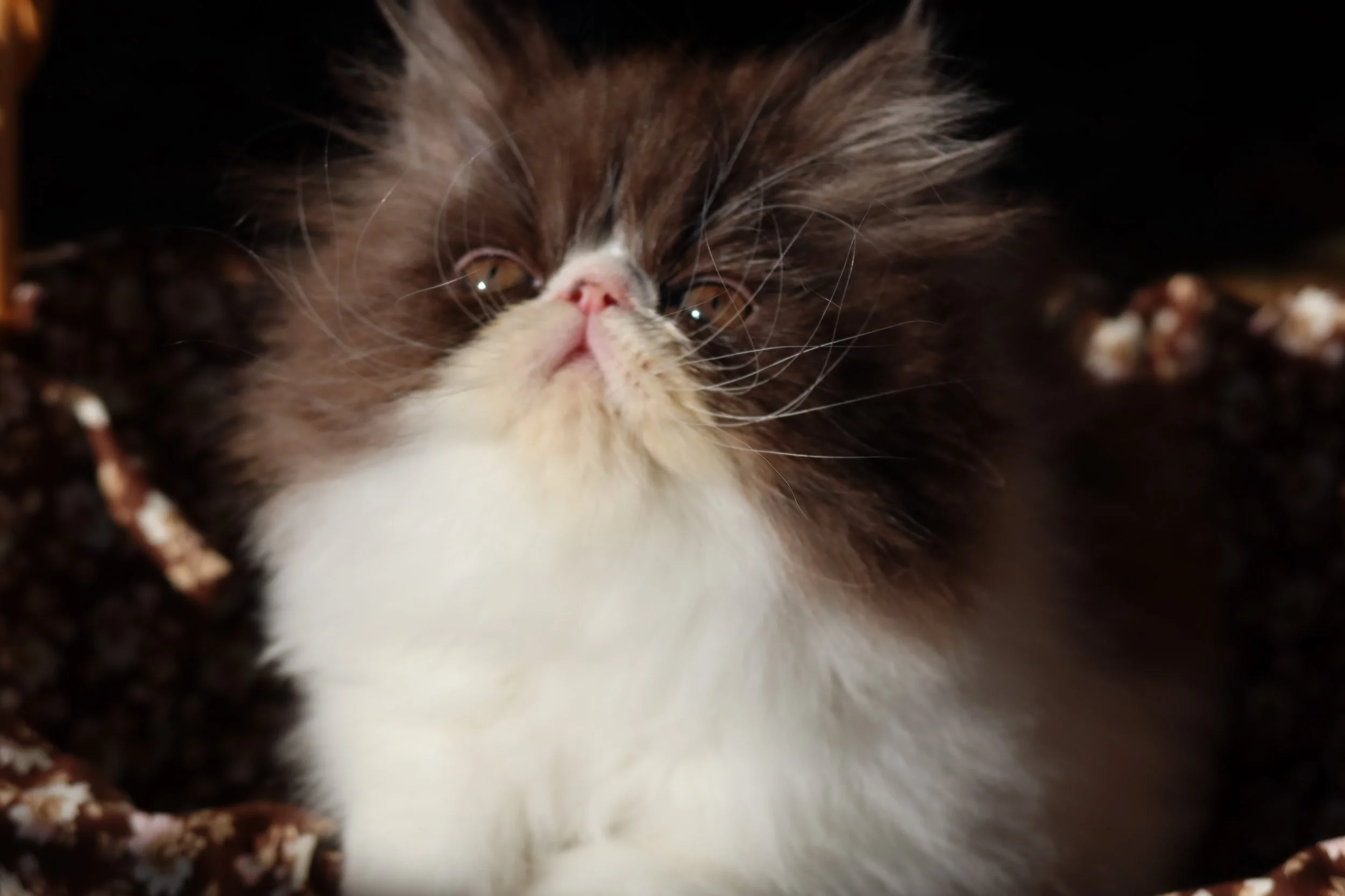 Little Franz is a male chocolate-white bicolor, peke-face Persian kitten.