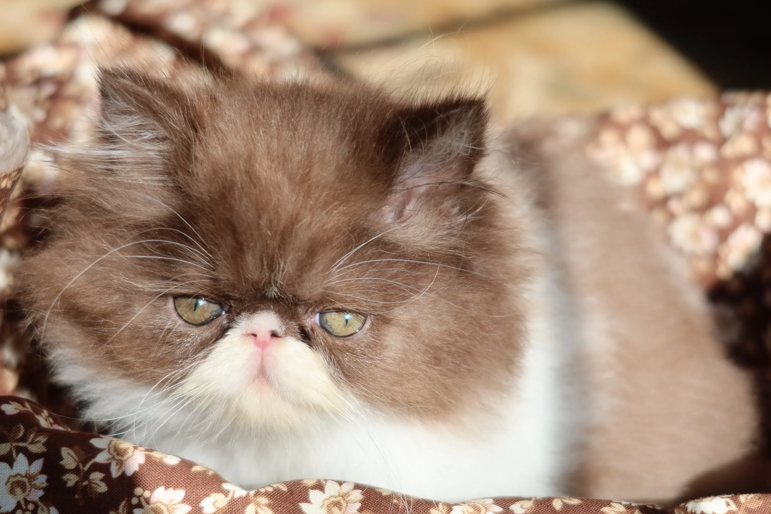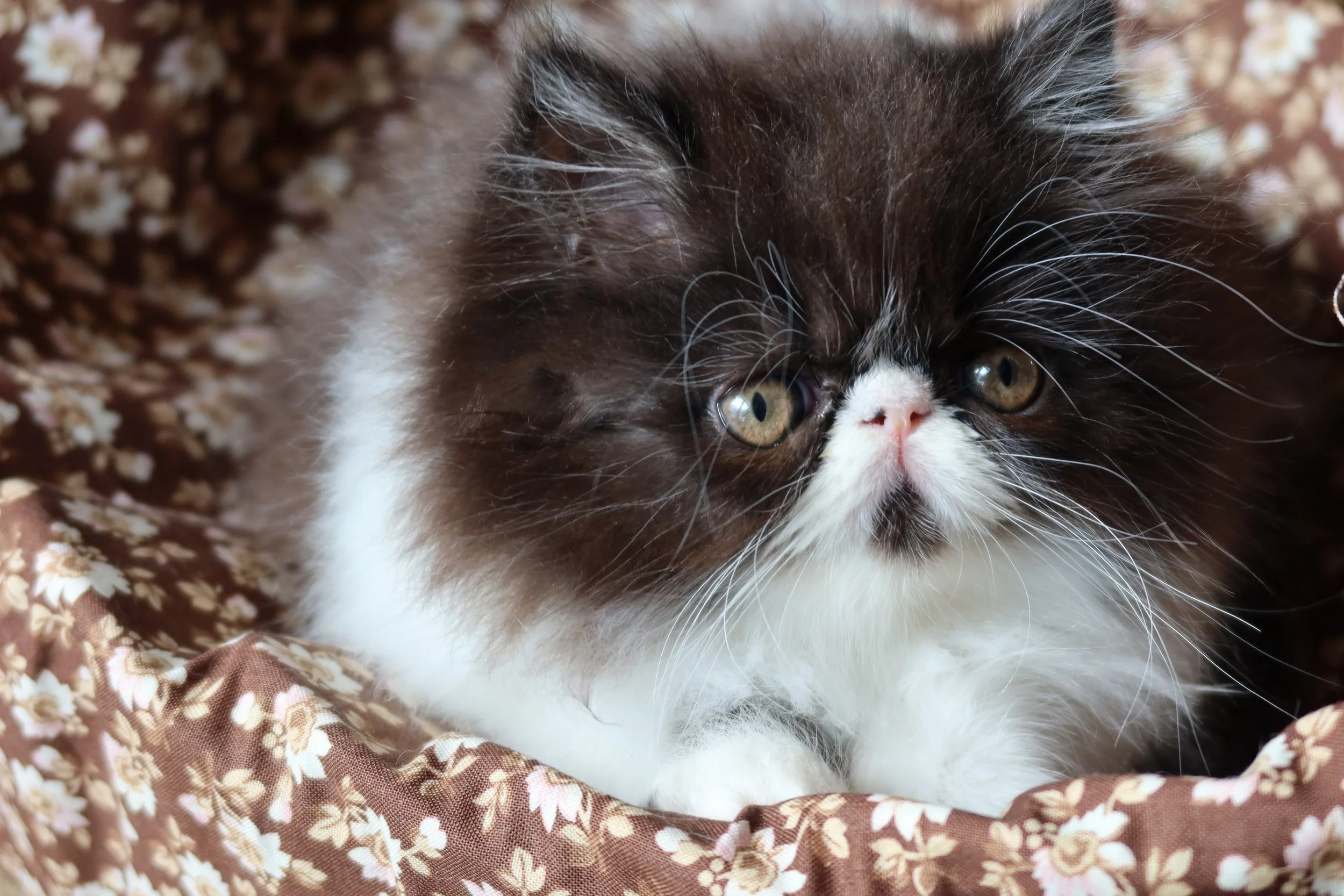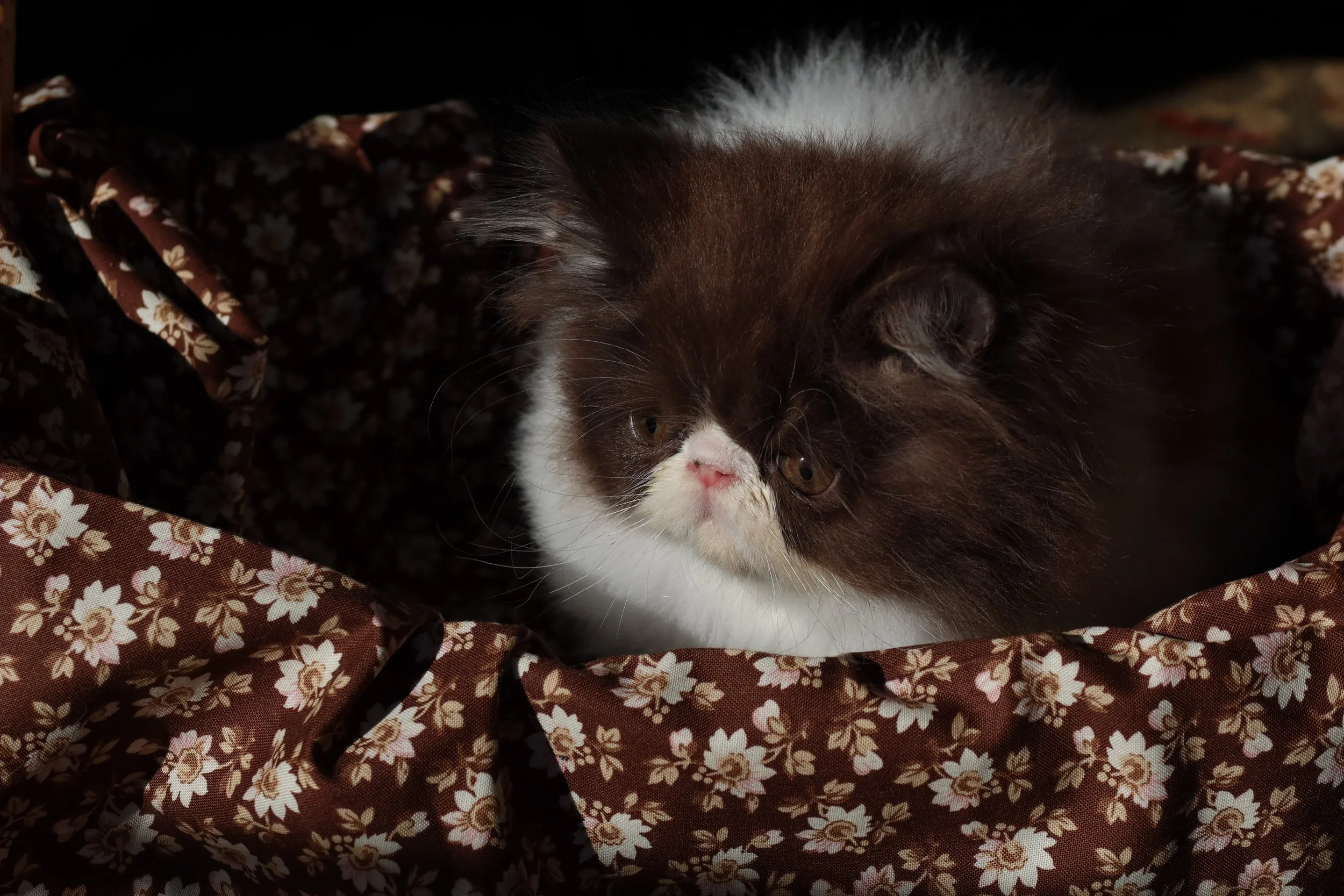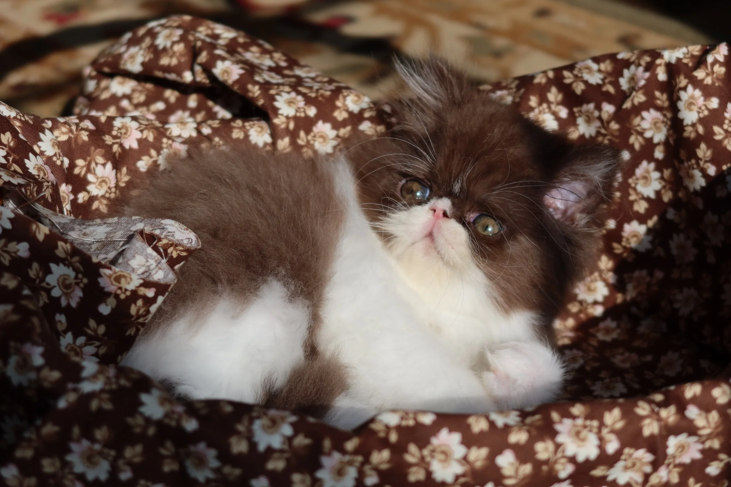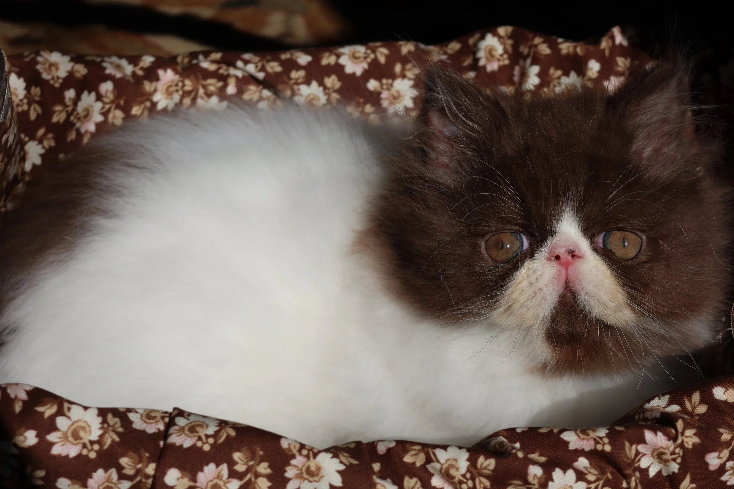 Little Franz is a male chocolate-white bicolor, peke-face Persian kitten.
