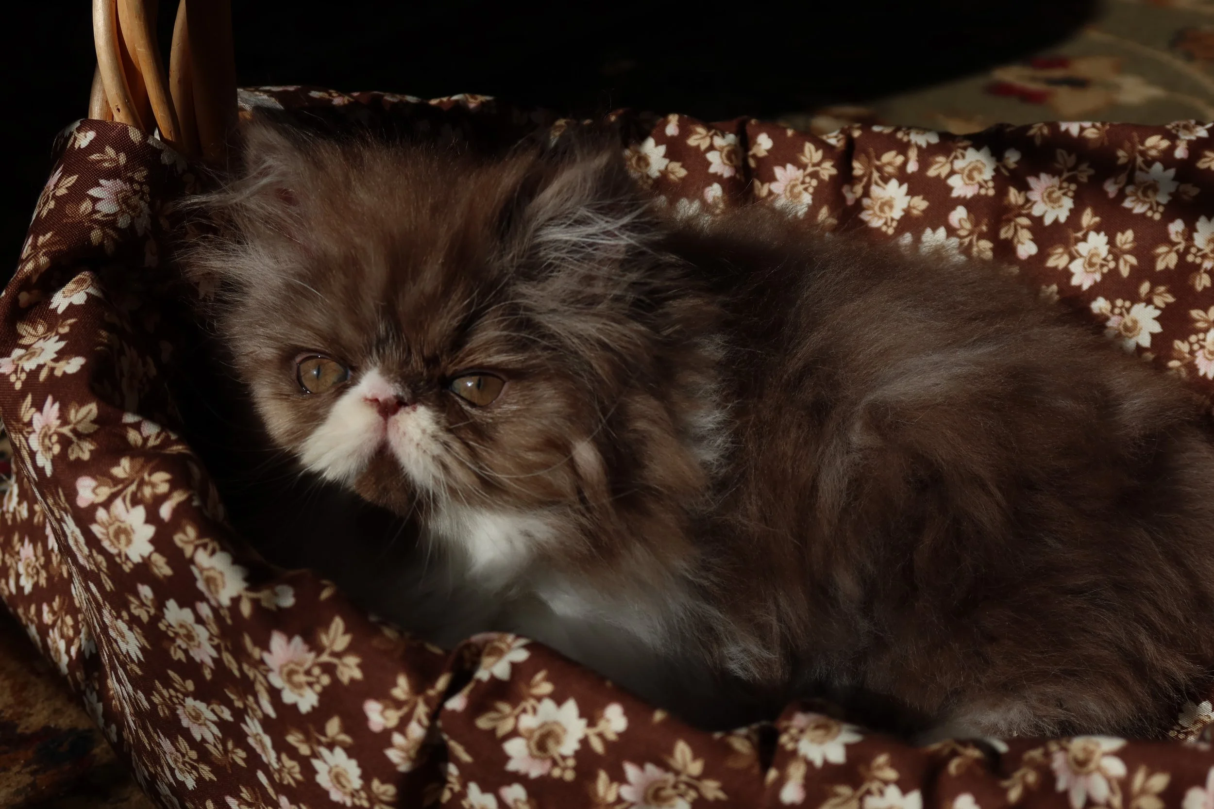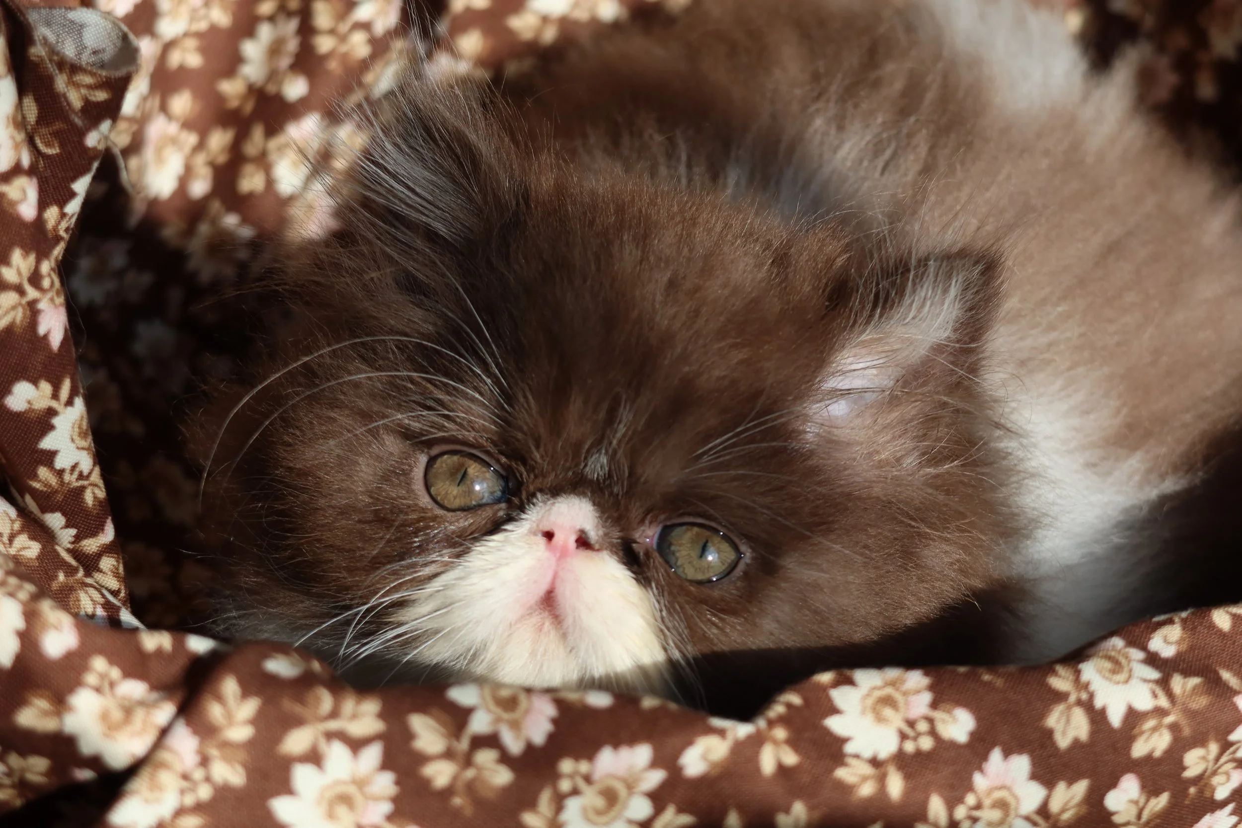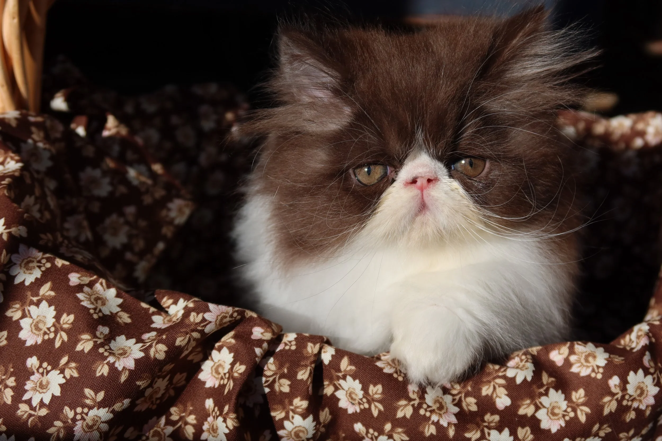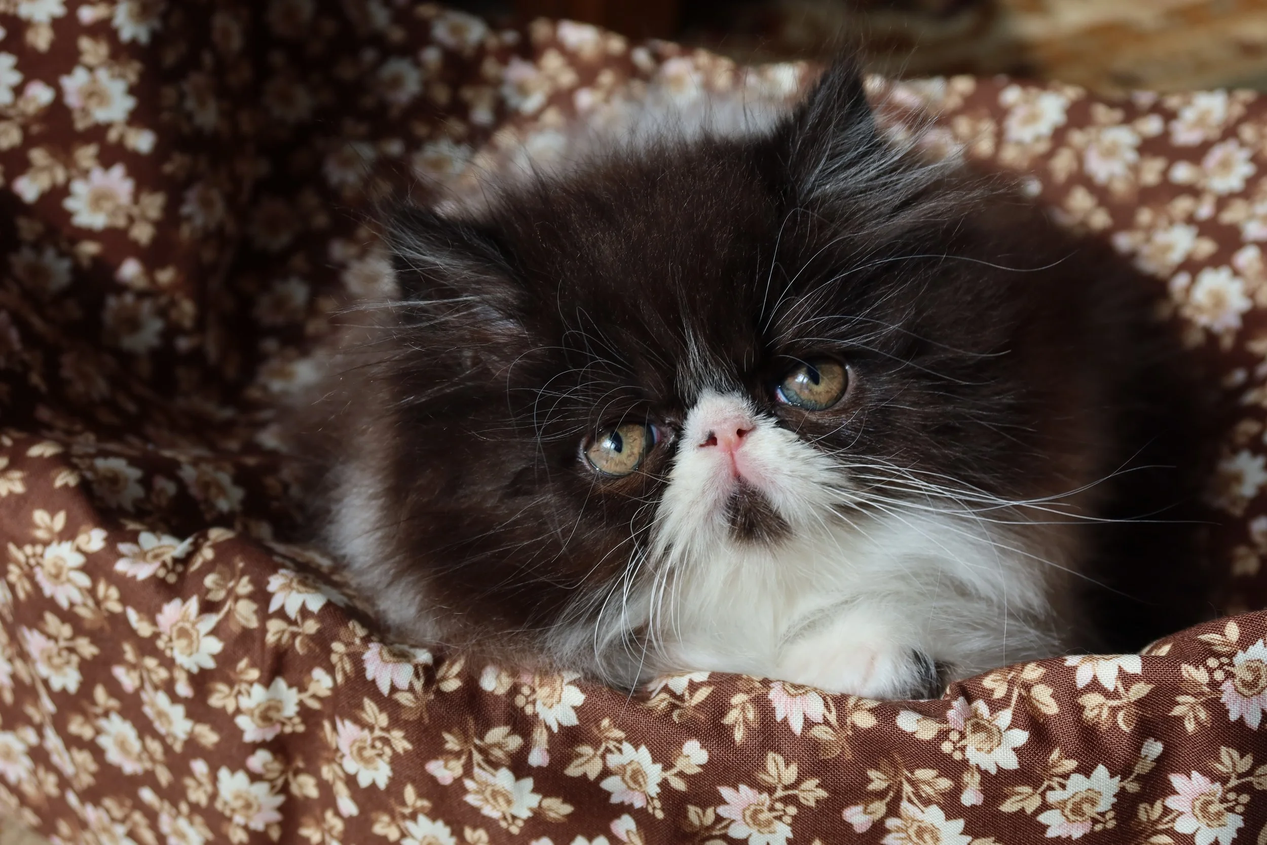 Little Franz is a male chocolate-white bicolor, peke-face Persian kitten.