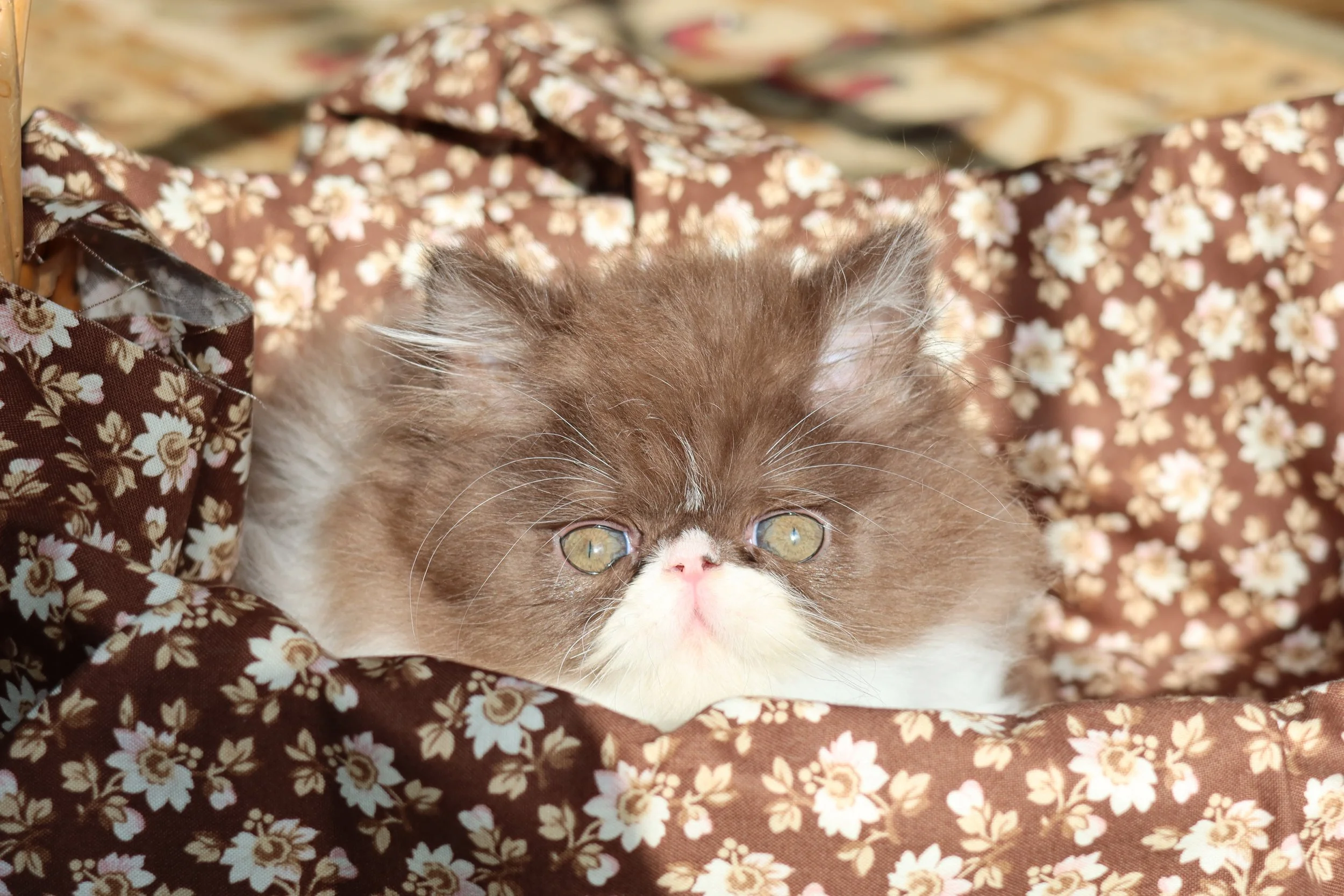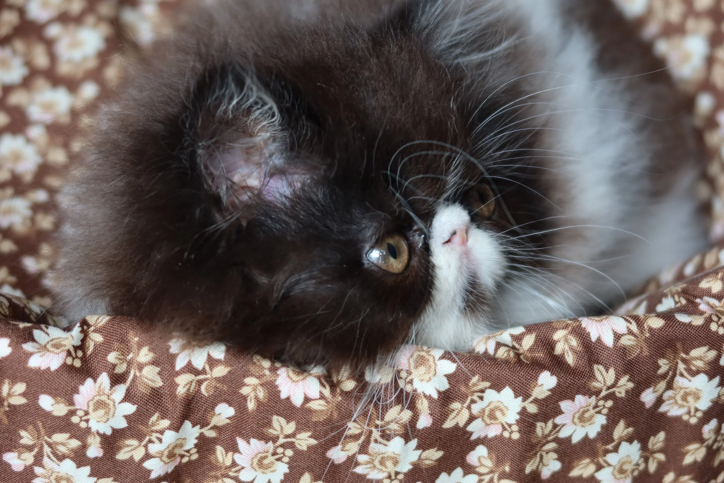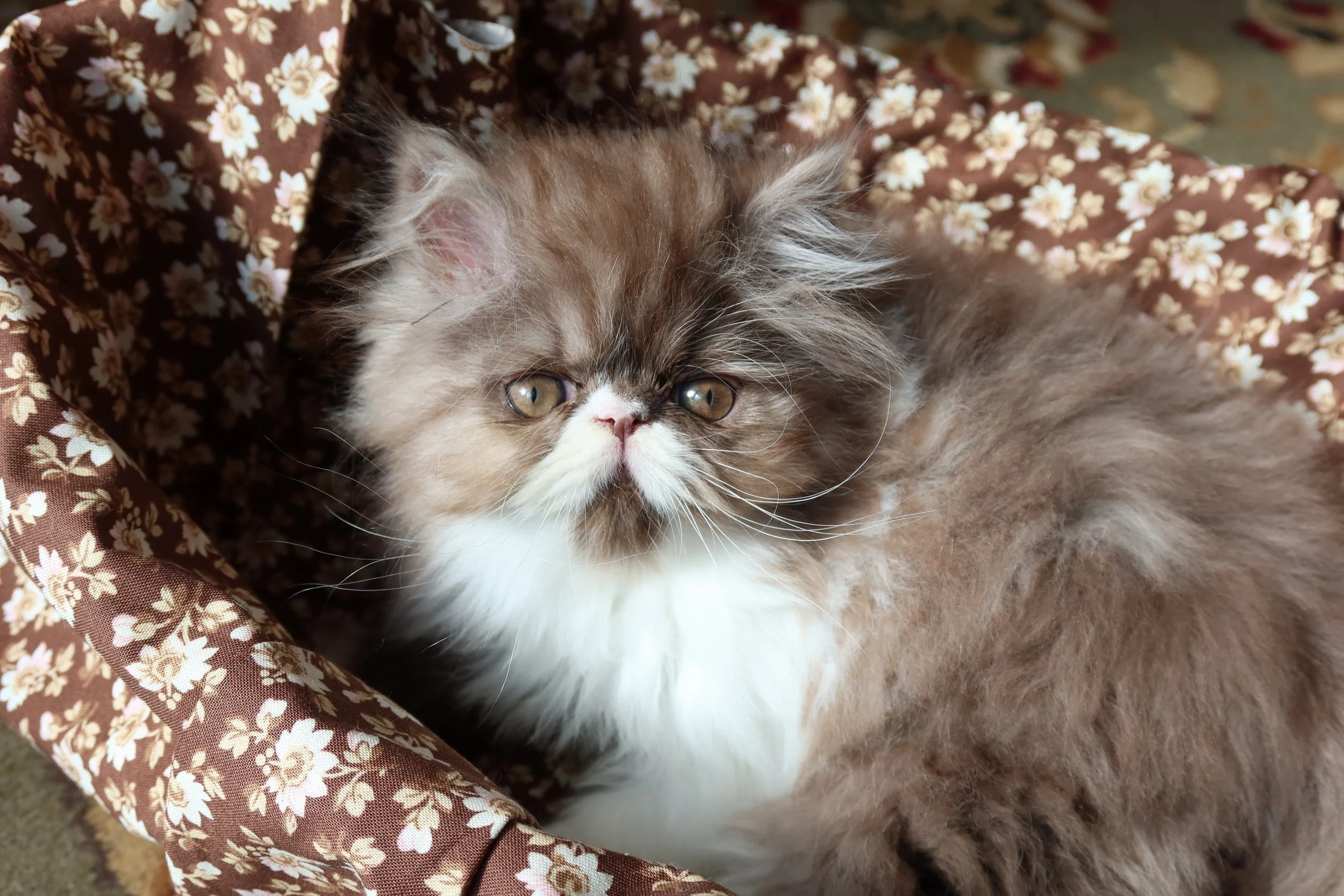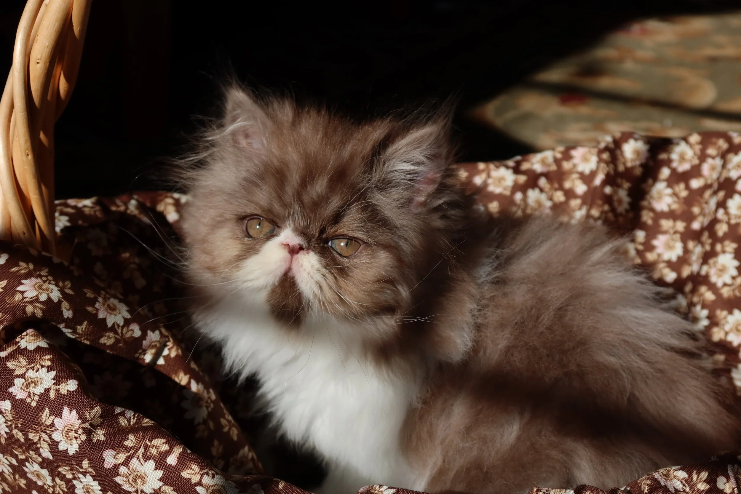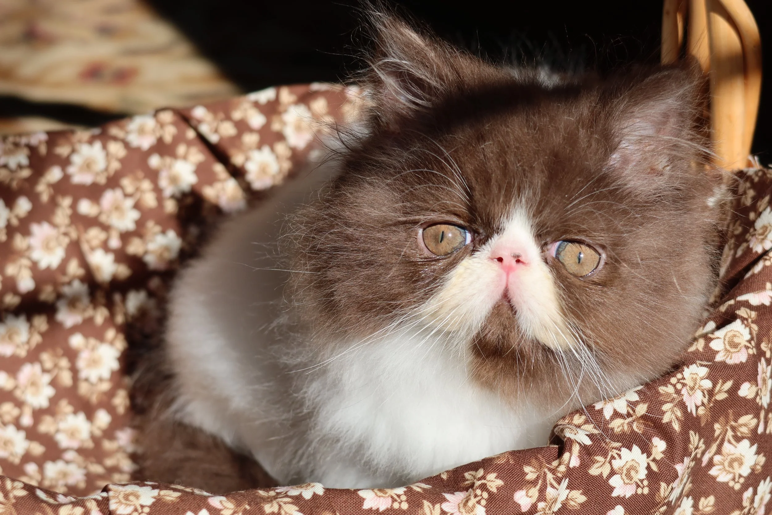Little Franz is a male chocolate-white bicolor, peke-face Persian kitten.