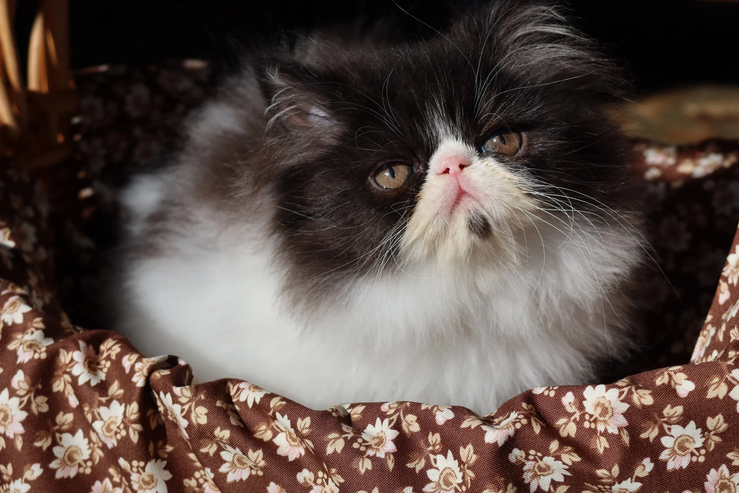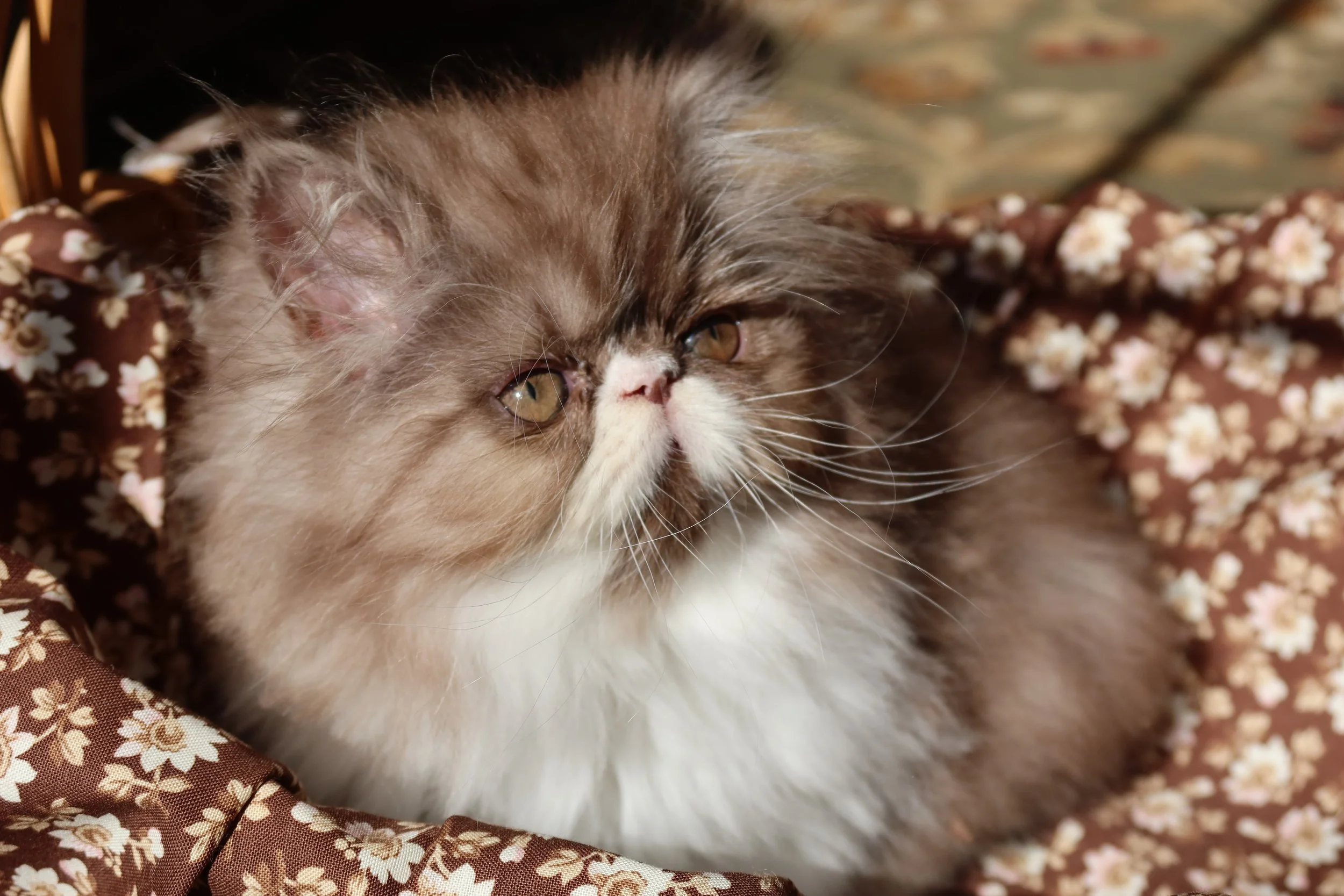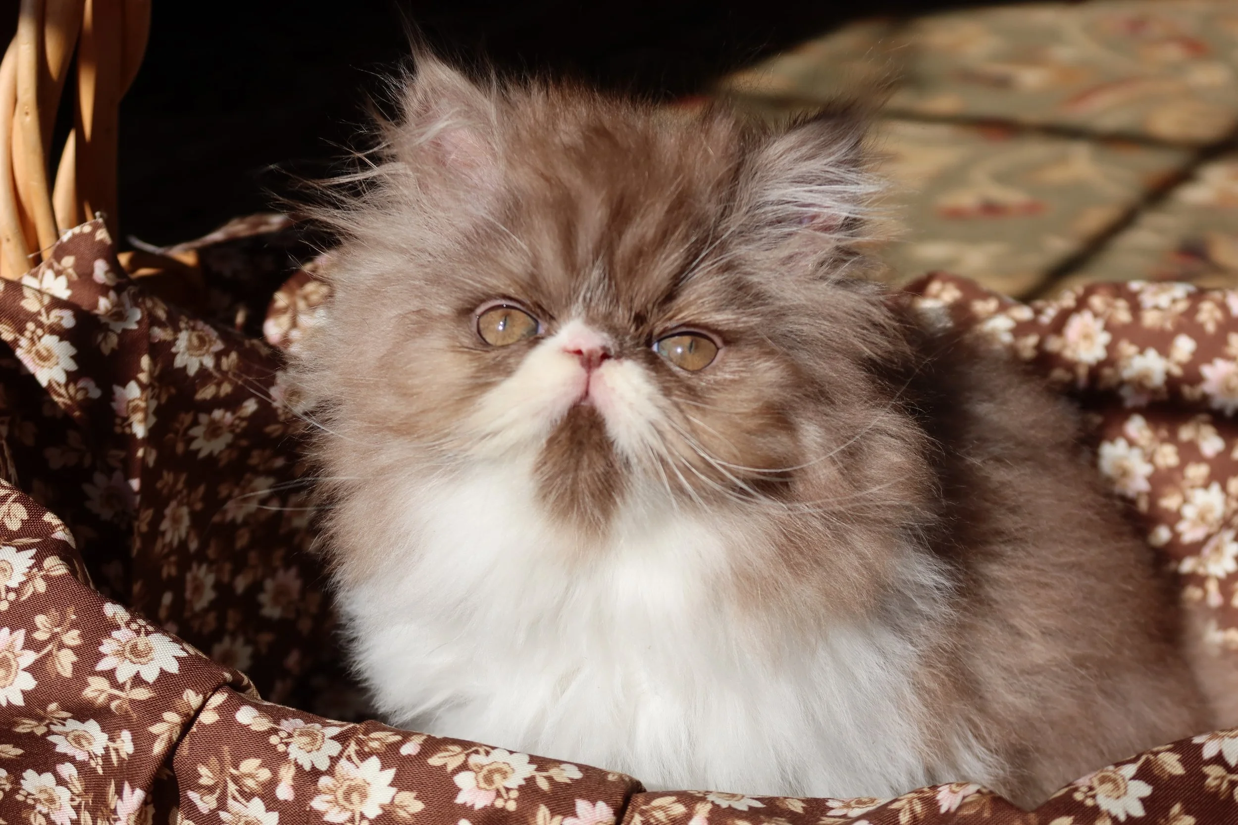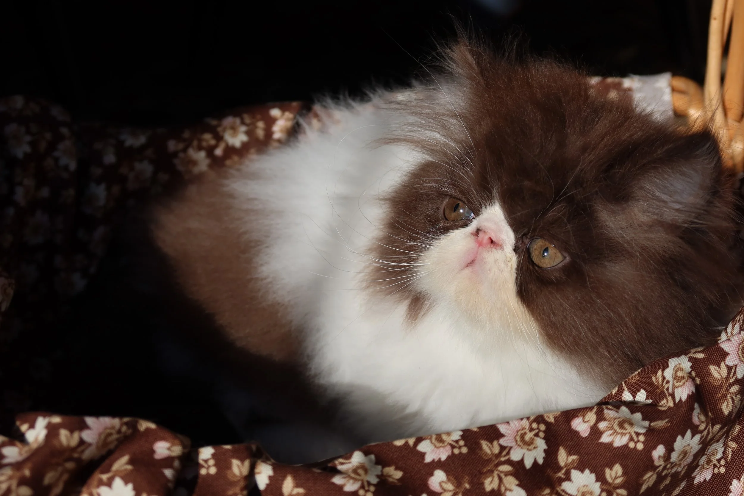 Little Franz is a male chocolate-white bicolor, peke-face Persian kitten.