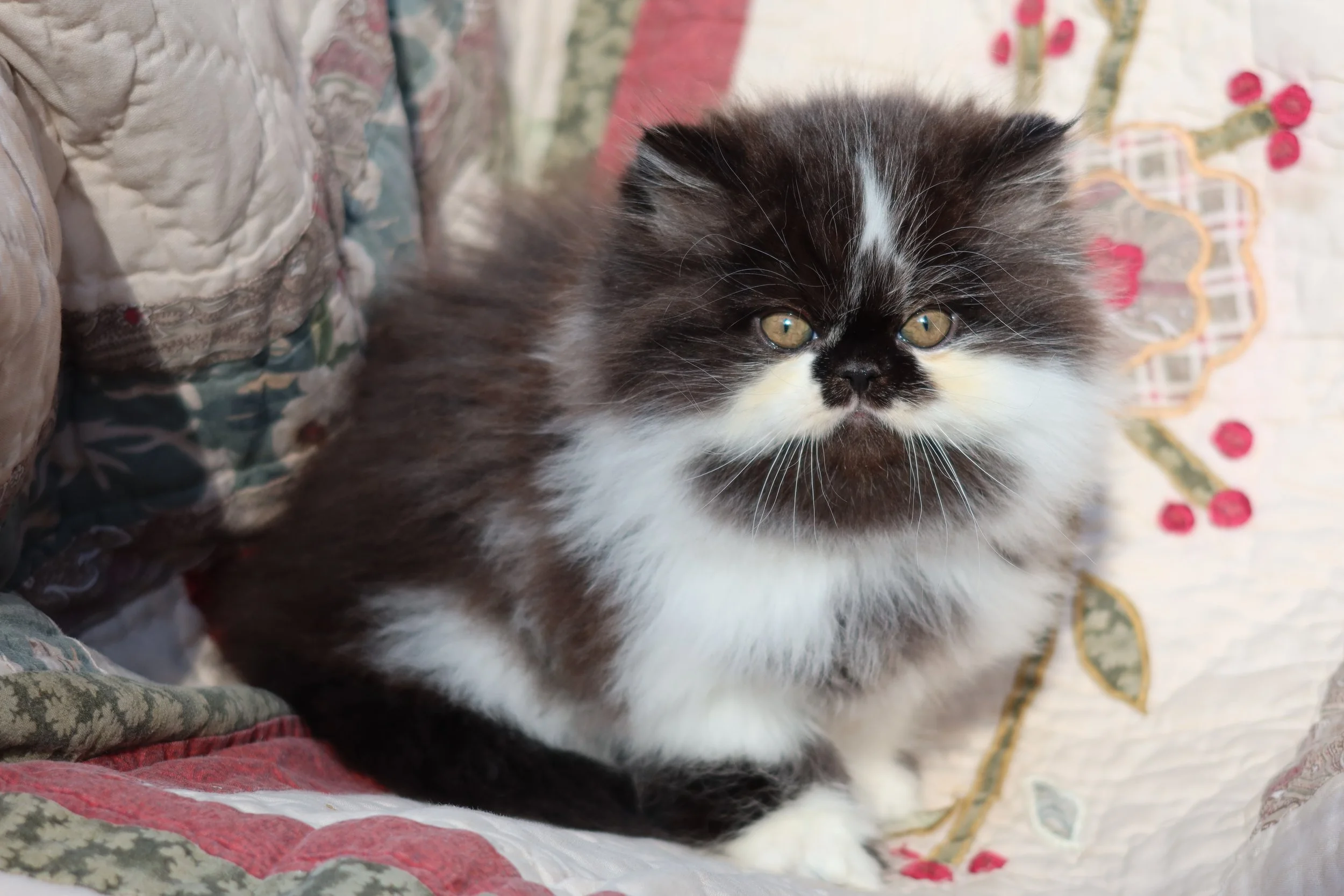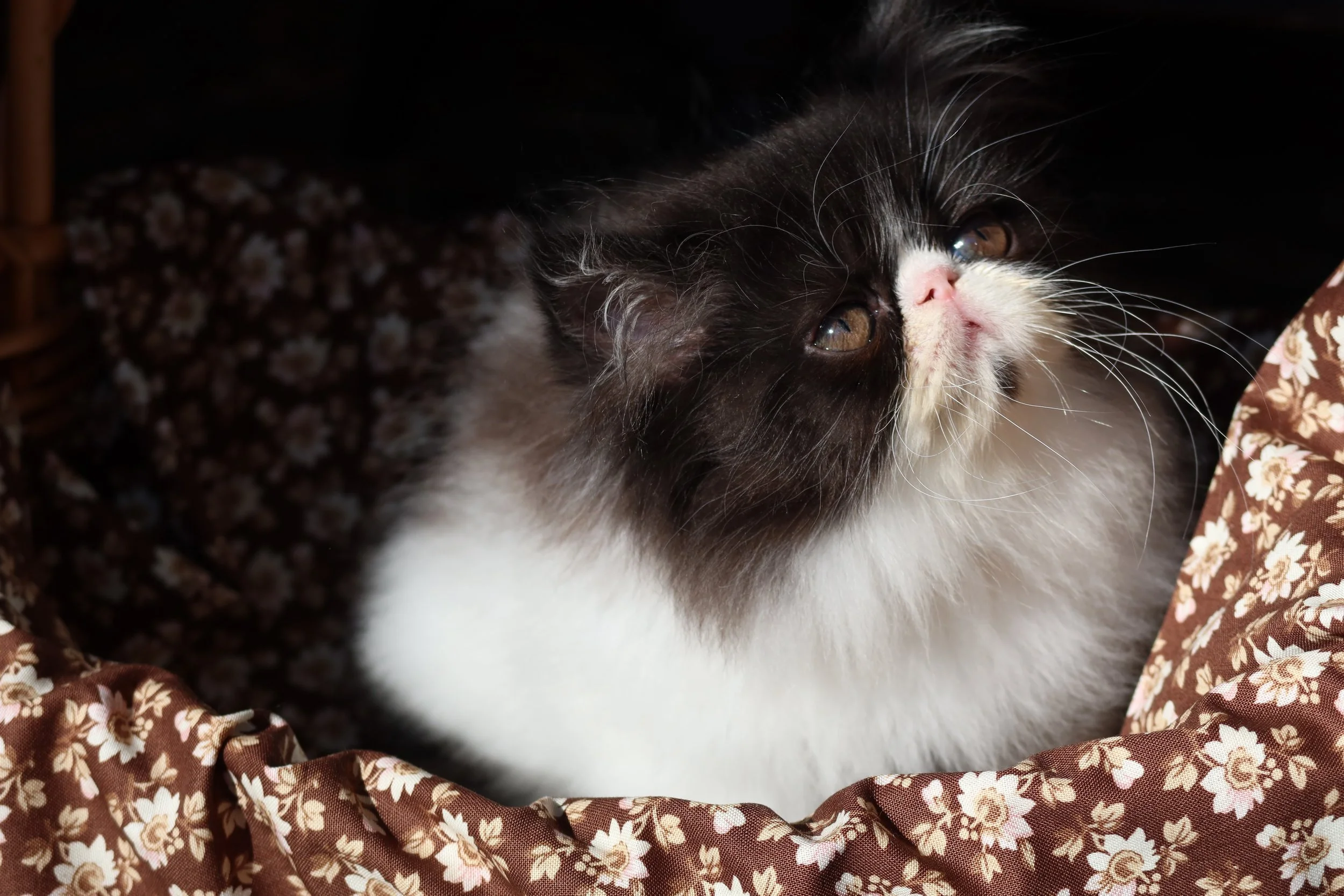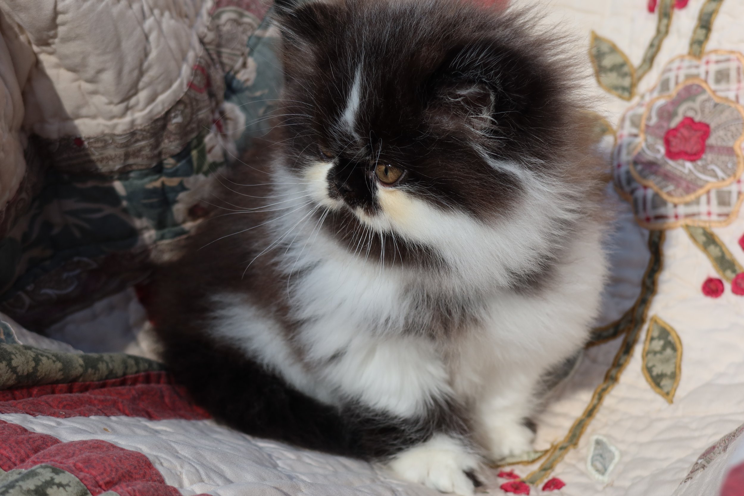 Boots is a male black-white bicolor, peke-face Persian kitten.