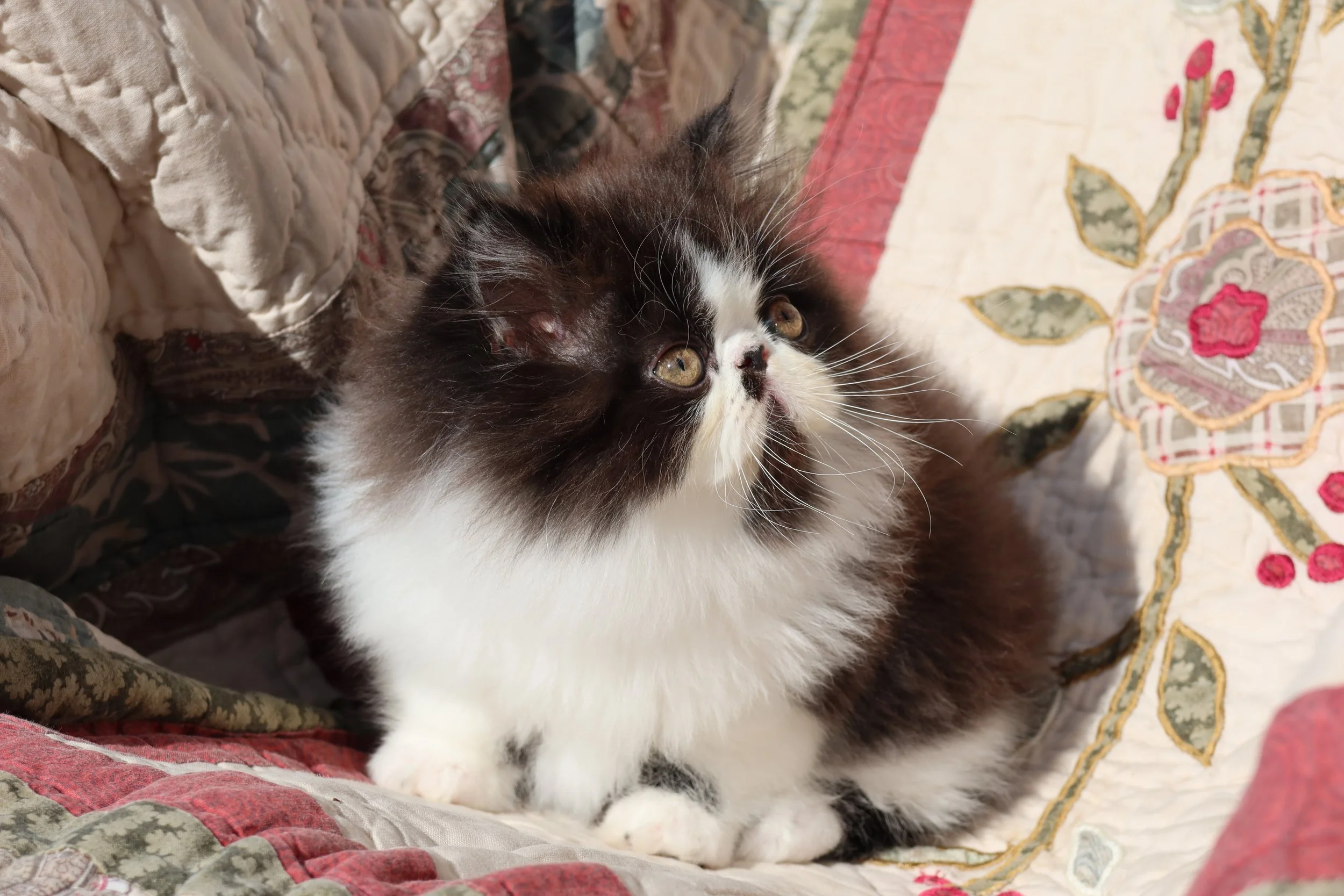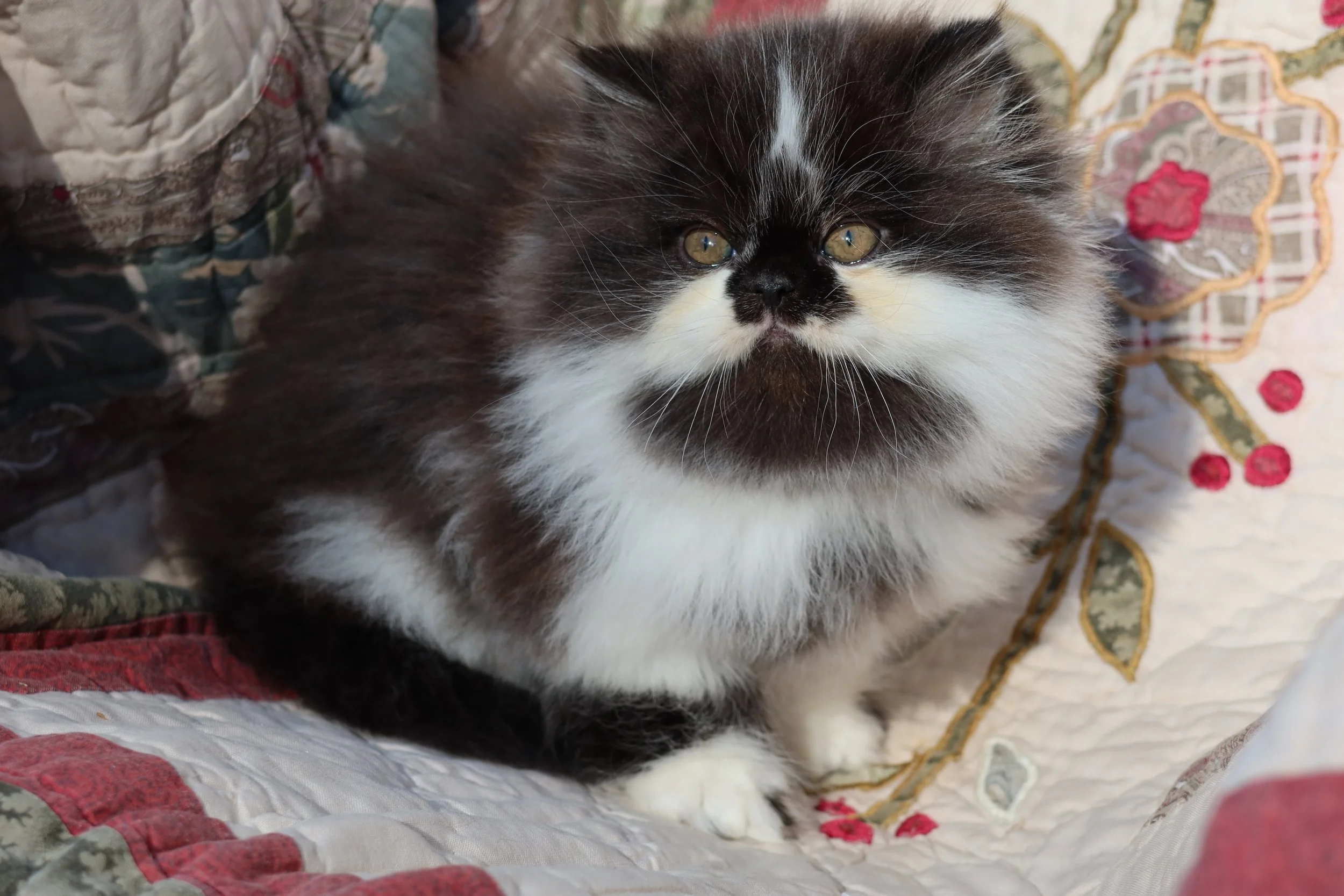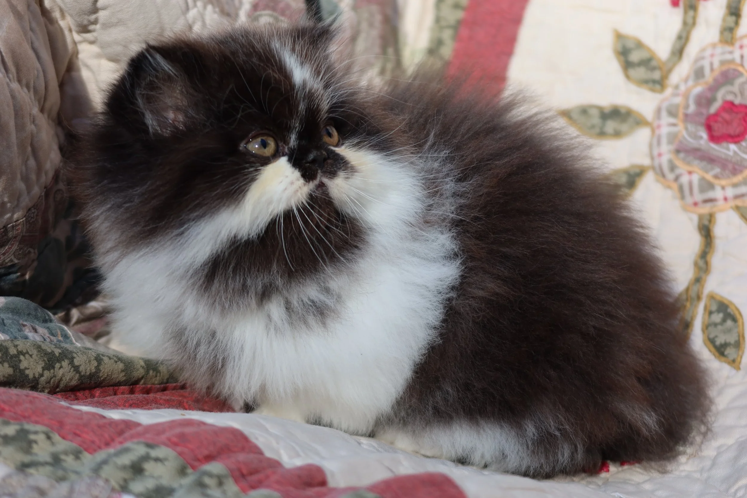 Boots is a male black-white bicolor, peke-face Persian kitten.