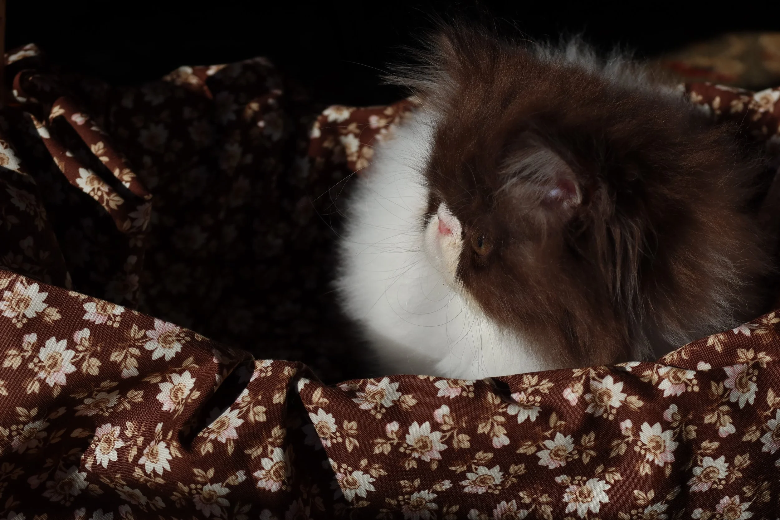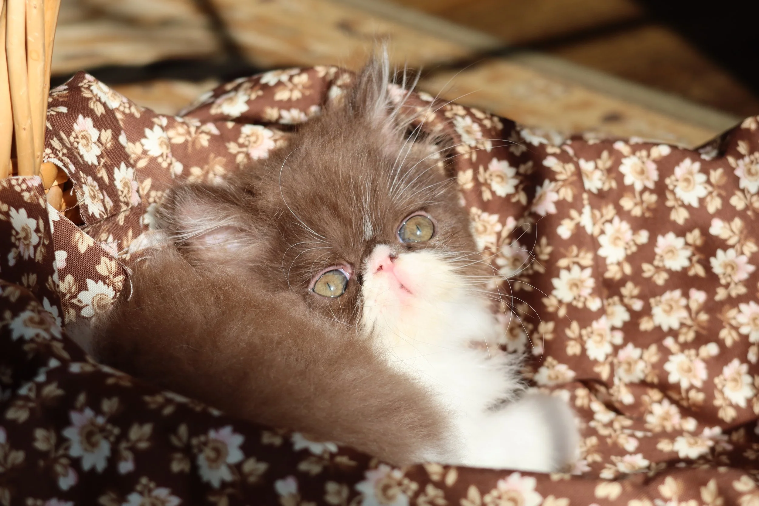 Badger & Eliza Jane had their adorable litter of six Persian kittens (4 males & 2 females) born 11-24-2025. There are four chocolate-white bicolors, and two black-white bicolors. Little Zachary, Cookie, Sheffy, and Little Franz are the names of the four males, and Shelby and Frannie are the names of the two females. This litter will be ready to go to their new homes February 2nd, 2026, at the soonest.