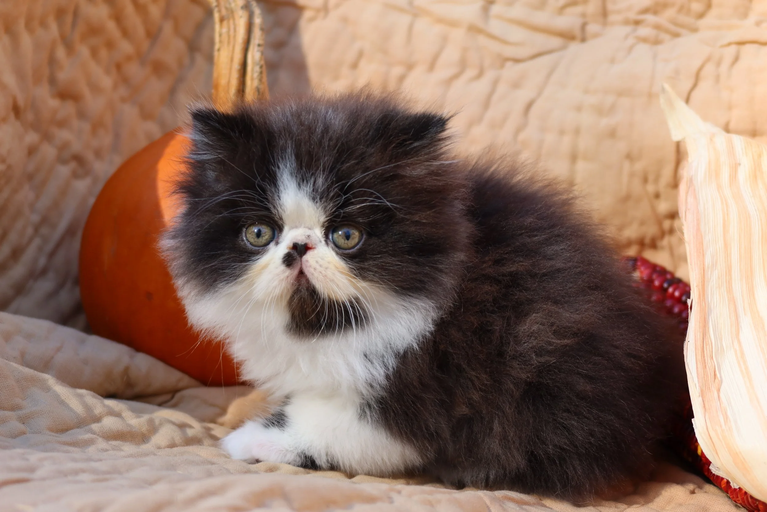Mittens is a female black-white bicolor, peke-face Persian kitten.