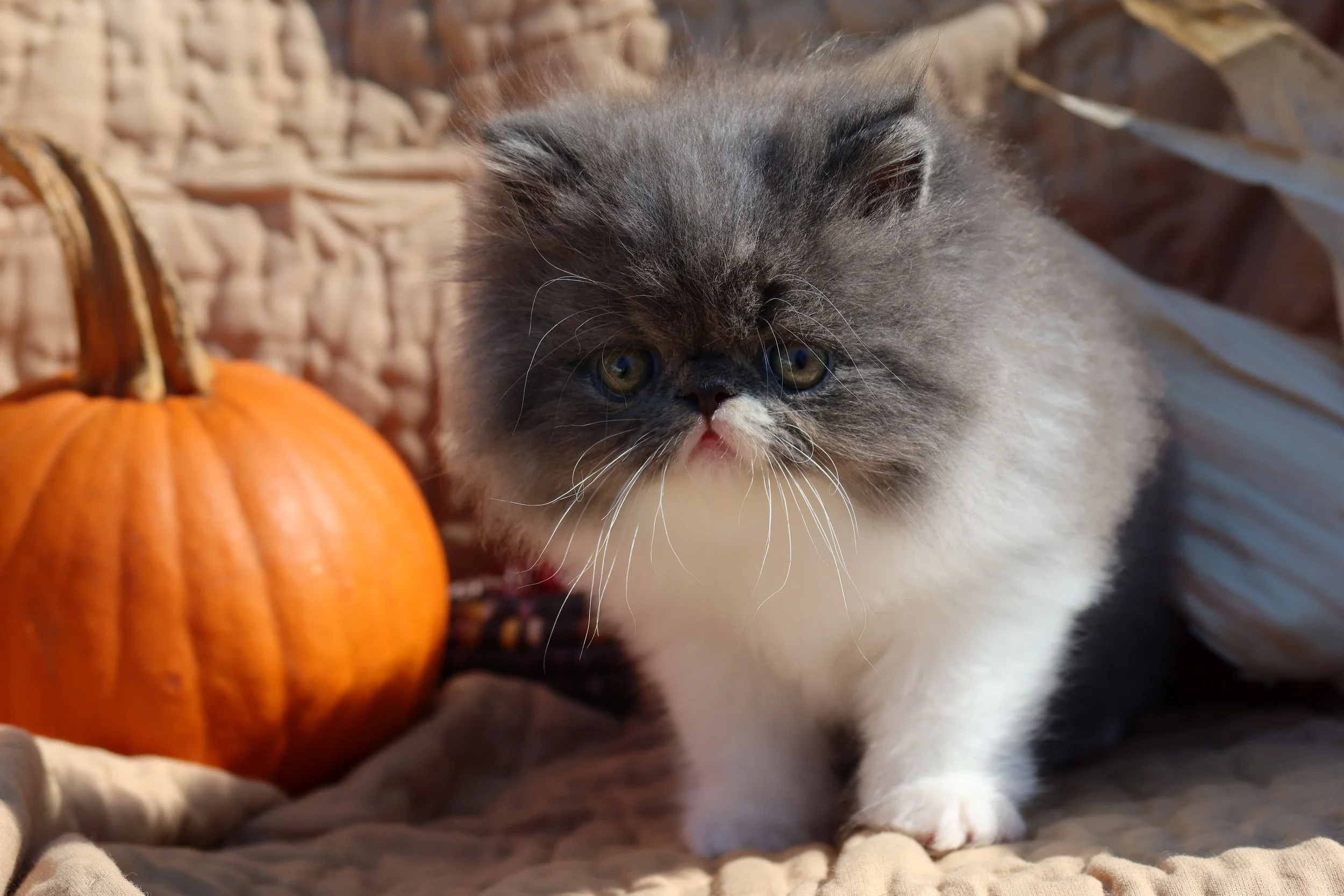 Whiskers is a male blue-white bicolor, peke-face Persian kitten.