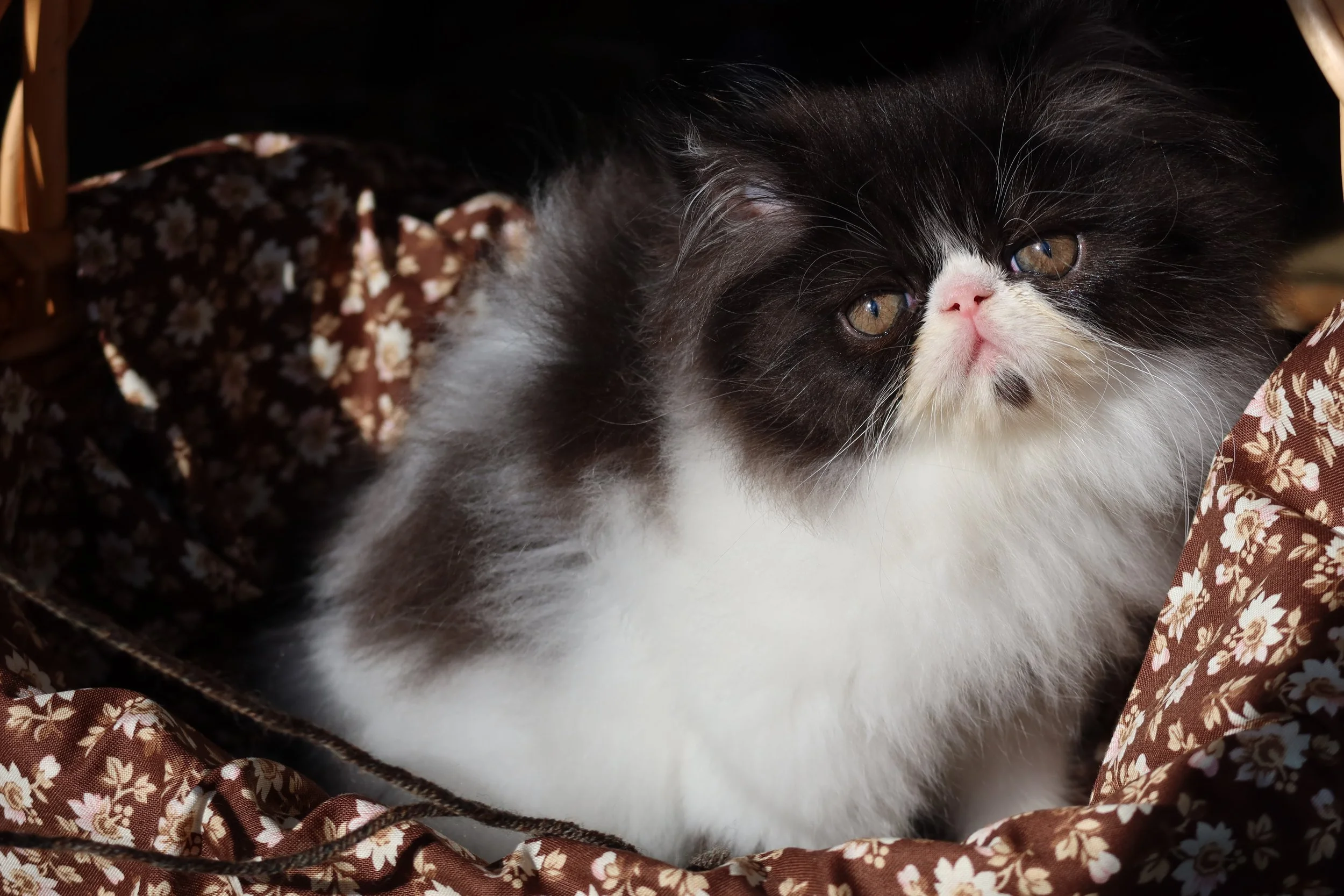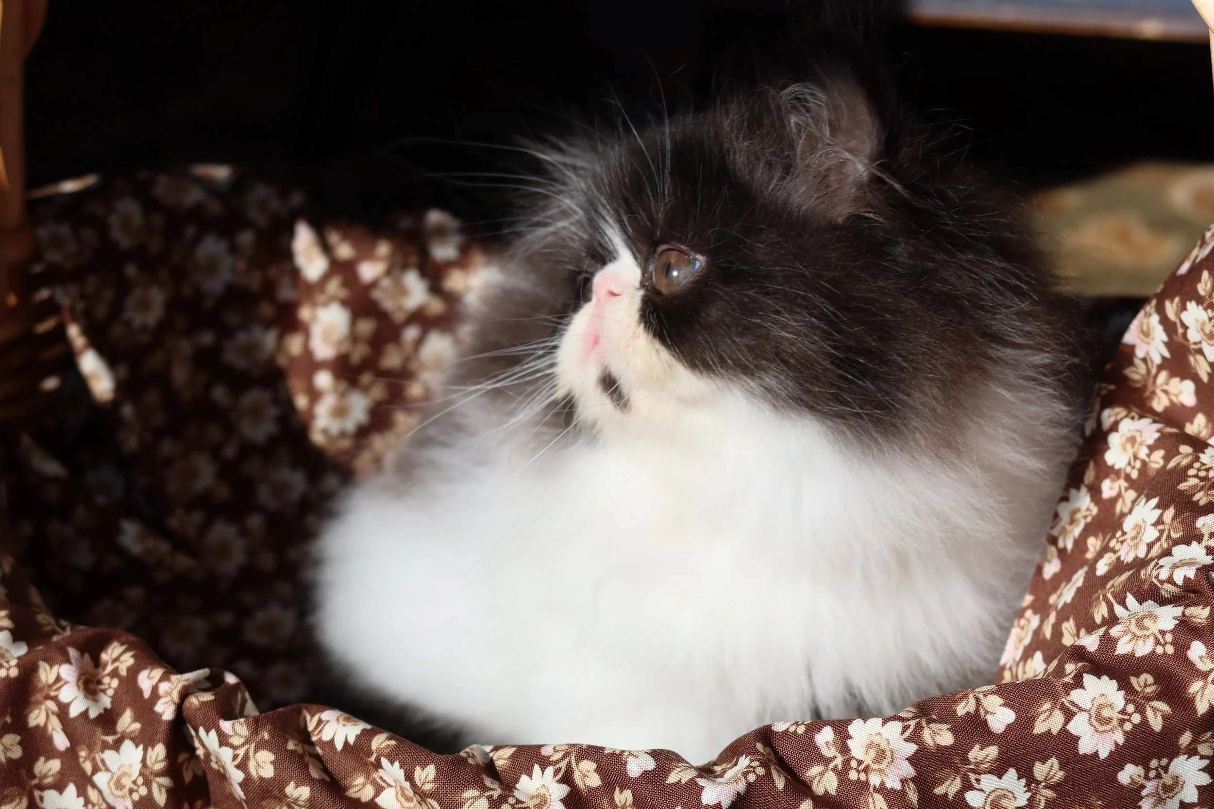 Frannie is a female chocolate-white bicolor, peke-face Persian kitten.