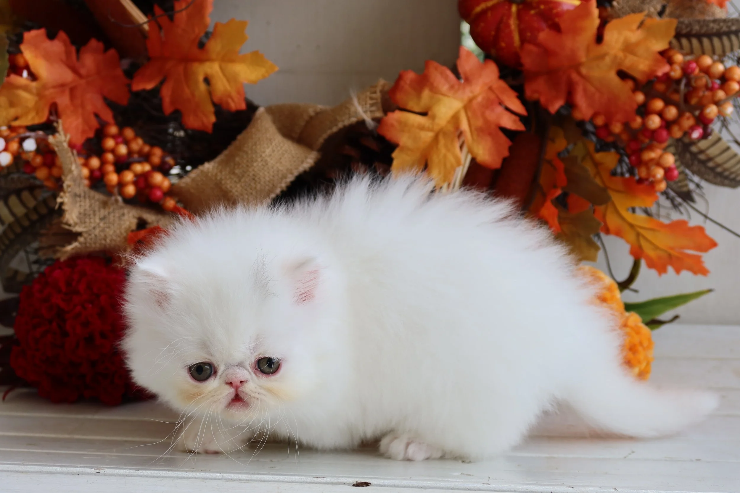 Frisky is a male solid white, peke-face Persian kitten.